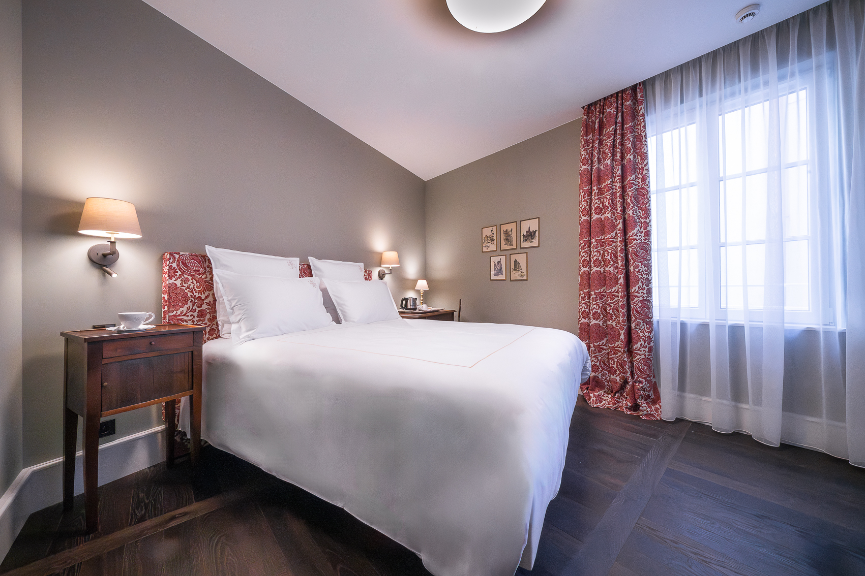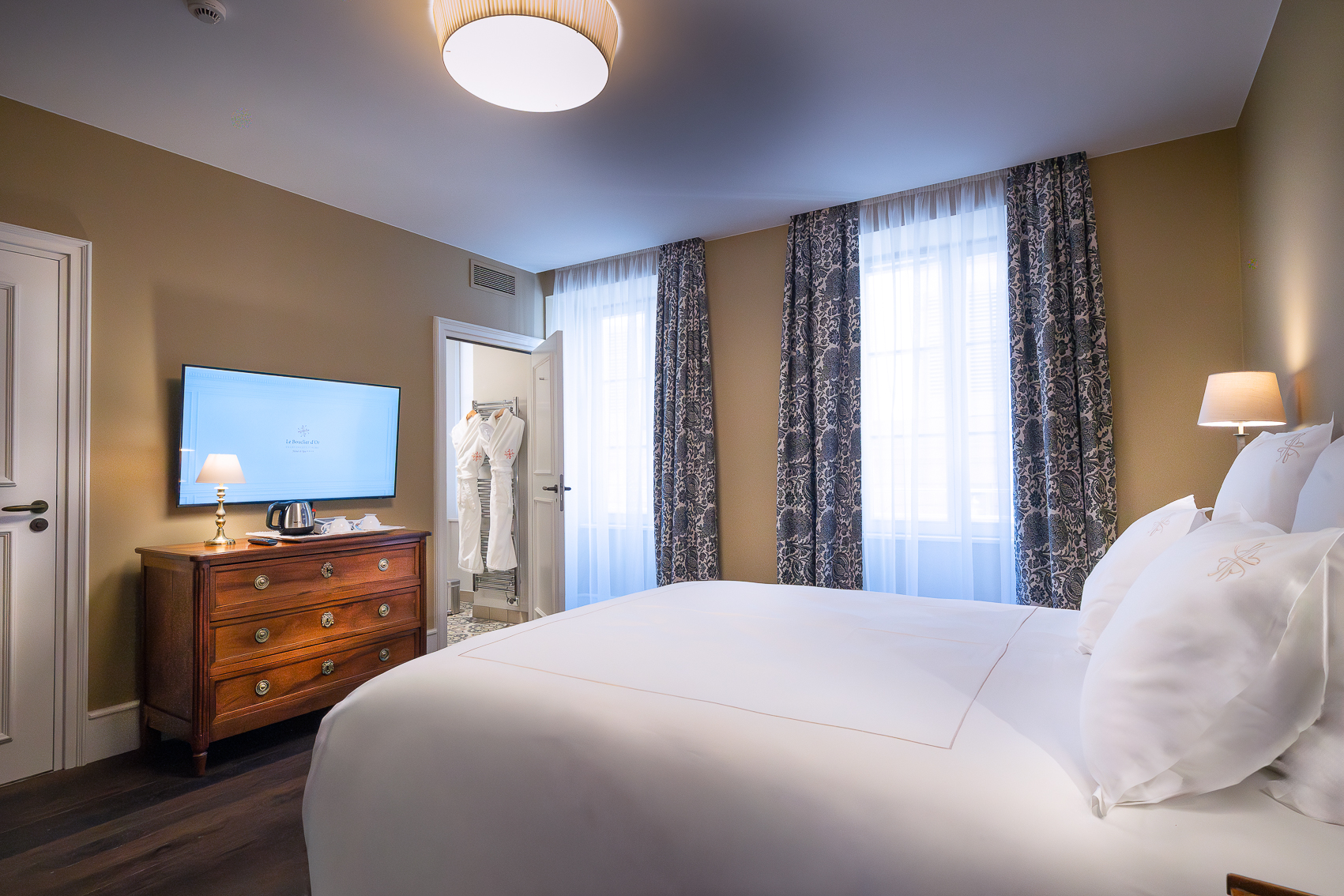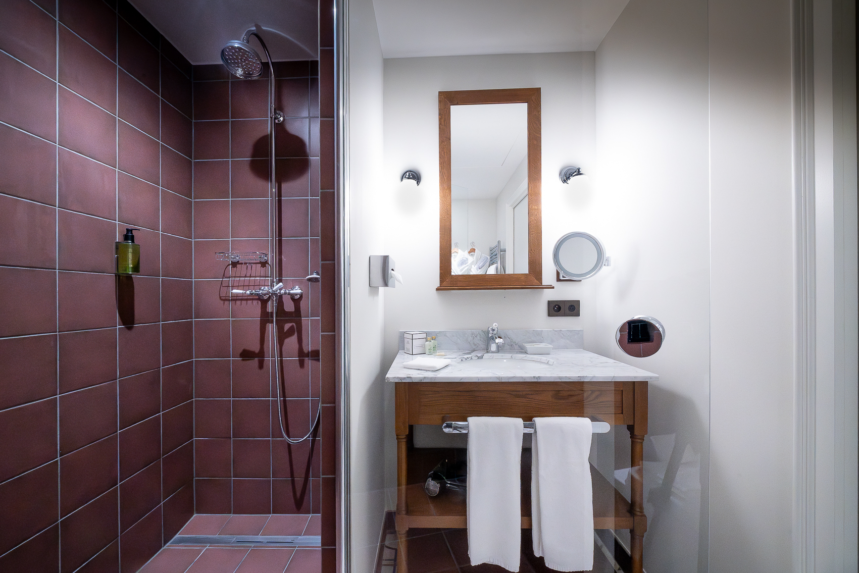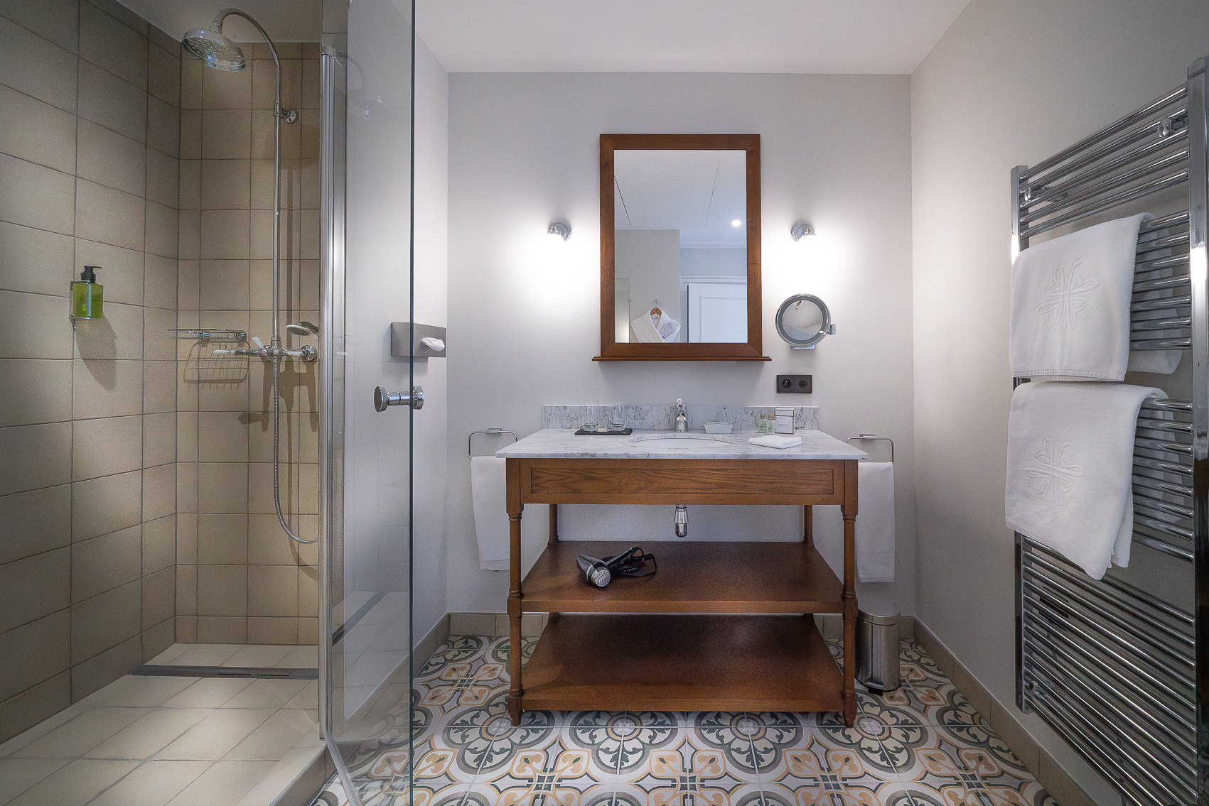 La salle de bain, pensée dans la continuité de la chambre, séduit par ses finitions élégantes et ses équipements de qualité. Un espace de vie intime et raffiné, idéal pour savourer pleinement le charme et le confort de l’hôtel.